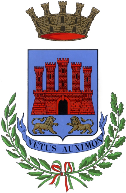 Osimo Coat of Arms (The Marches Region - Italy). Image, Field Partition, Charges, Tinctures and Gonfalon. Symbols: Lion, Tower